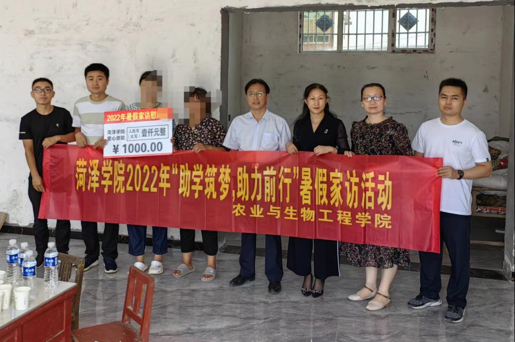 为深入宣传贯彻党和国家、学校有关高校家庭经济困难学生的资助政策,进一步了解家庭经济困难学生的实际困难,全面落实精准资助,提高资助育人成效,更好助力学生成长成才,农业与生物工程学院于7月1日开展“助学筑梦,助力前行”暑期家访活动,菏泽学院学工部部长杨红兵、我院党委书记刘燕、学工办主任黄燕丽、辅导员许修垒,李风光、班主任刘建赴菏泽曹县安蔡楼镇走访慰问家庭经济困难学生。