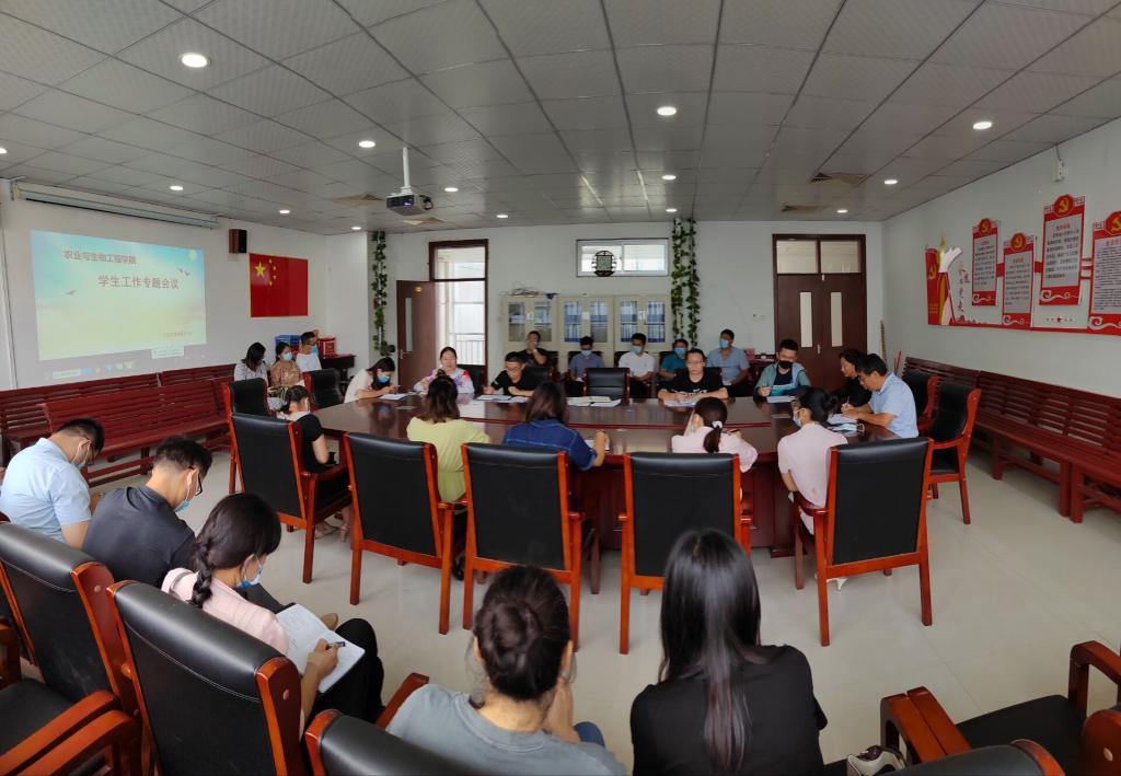 为精细化做好2022年秋季学期开学学生返校、疫情防控、安全教育、宿舍搬迁、学风建设等各项工作,增强班主任在疫情防控期间的思想政治教育工作实效性,农业与生物工程学院于8月26日在综合实验楼w224会议室召开学生工作专题会议,学院党委书记刘燕、党委副书记李战国、副院长张国松、全体辅导员及班主任参加本次会议。会议由党委书记刘燕主持。